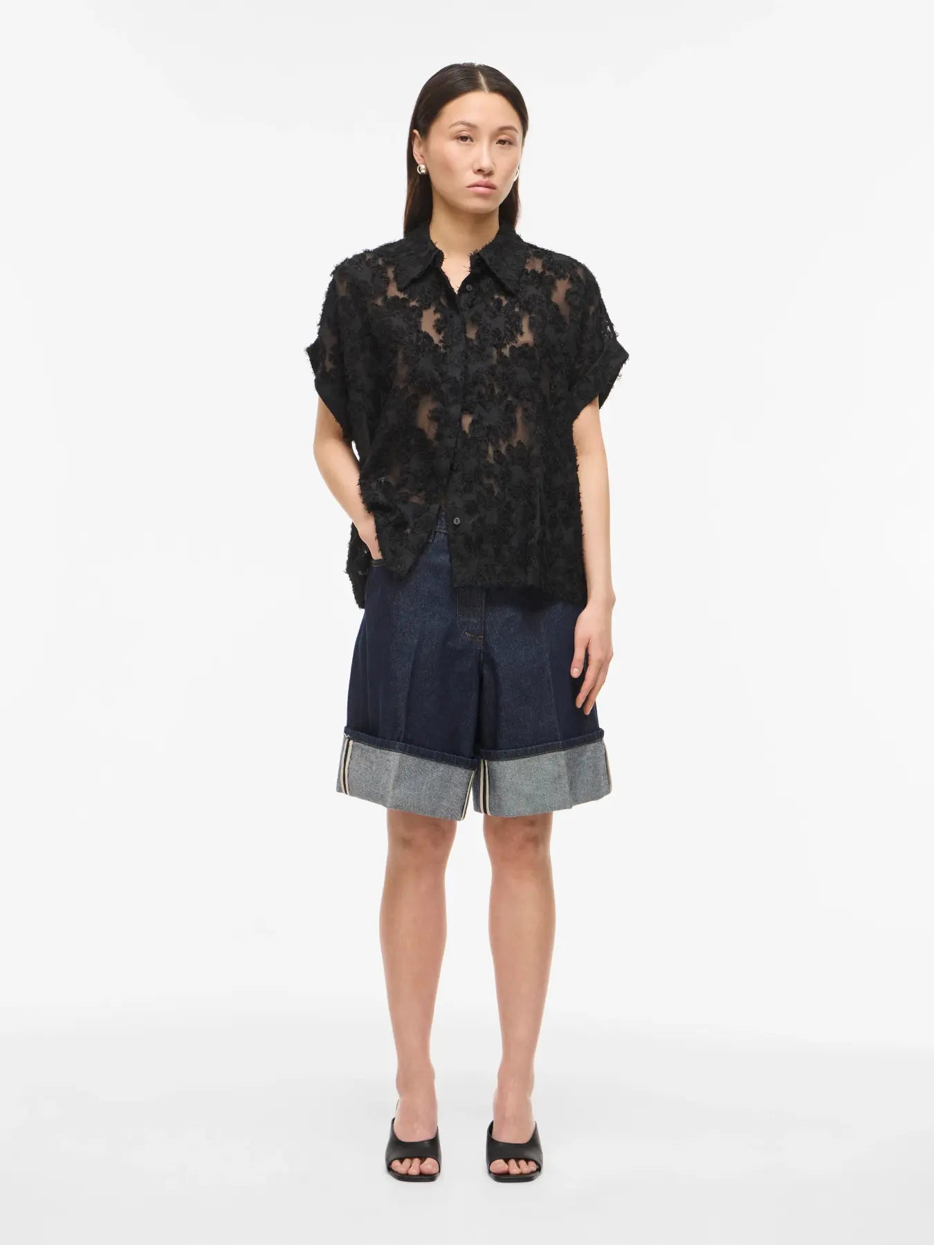 Camisa de textura floral con transparencias, para brindar originalidad a cualquier look.
