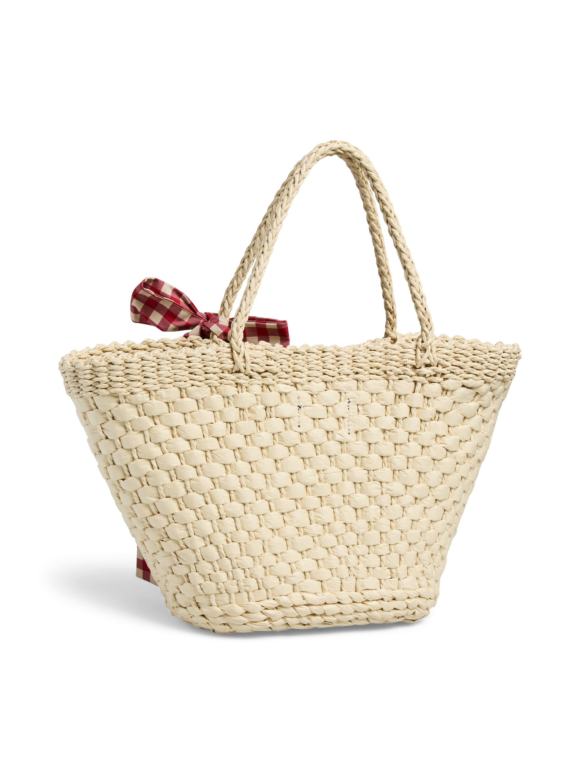 Capazo en paja de papel con detalle de lazo en vichy..