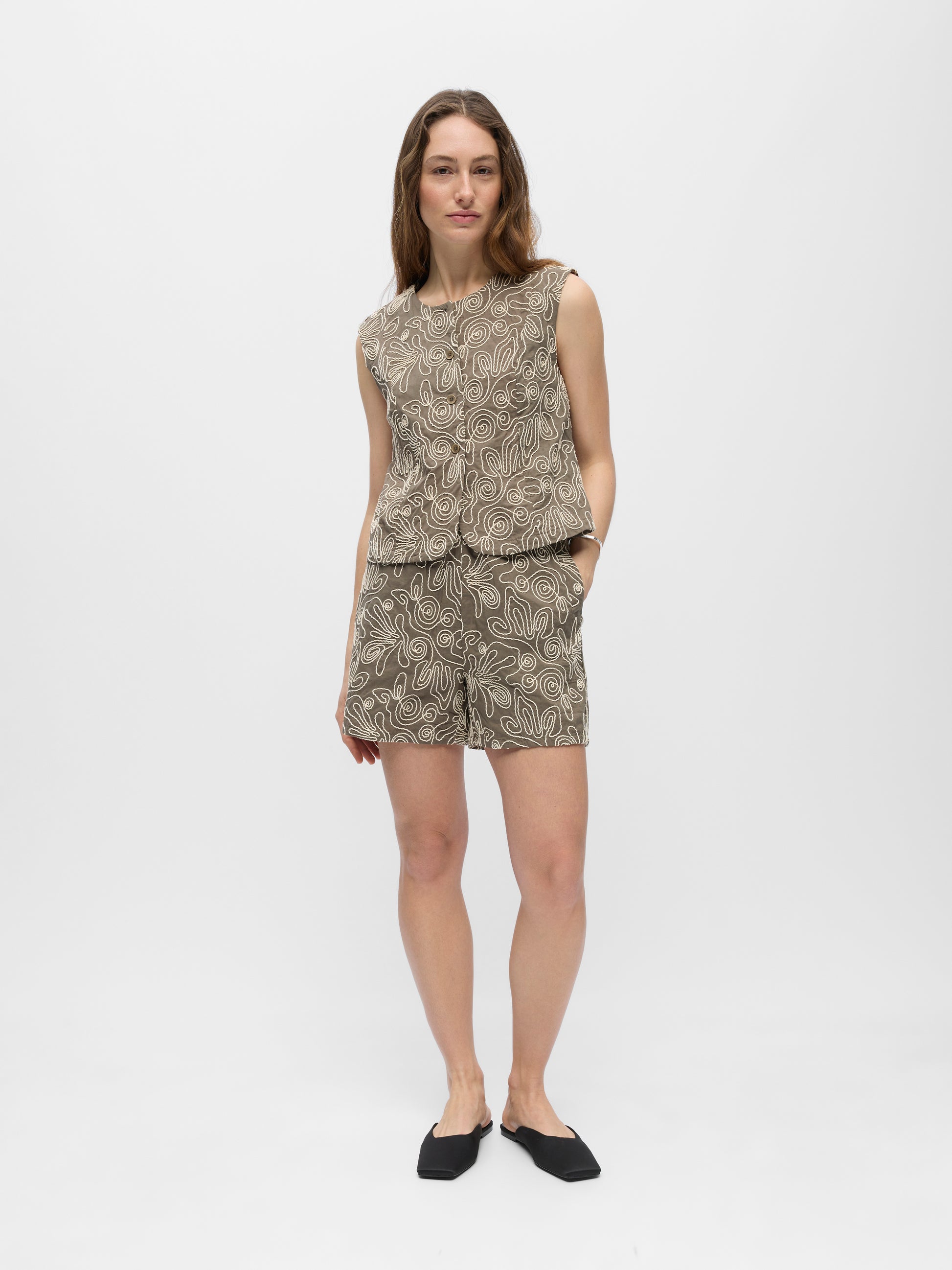Conjunto de chaleco y pantalón con goma ajustable. Detalle de bordados irregulares.