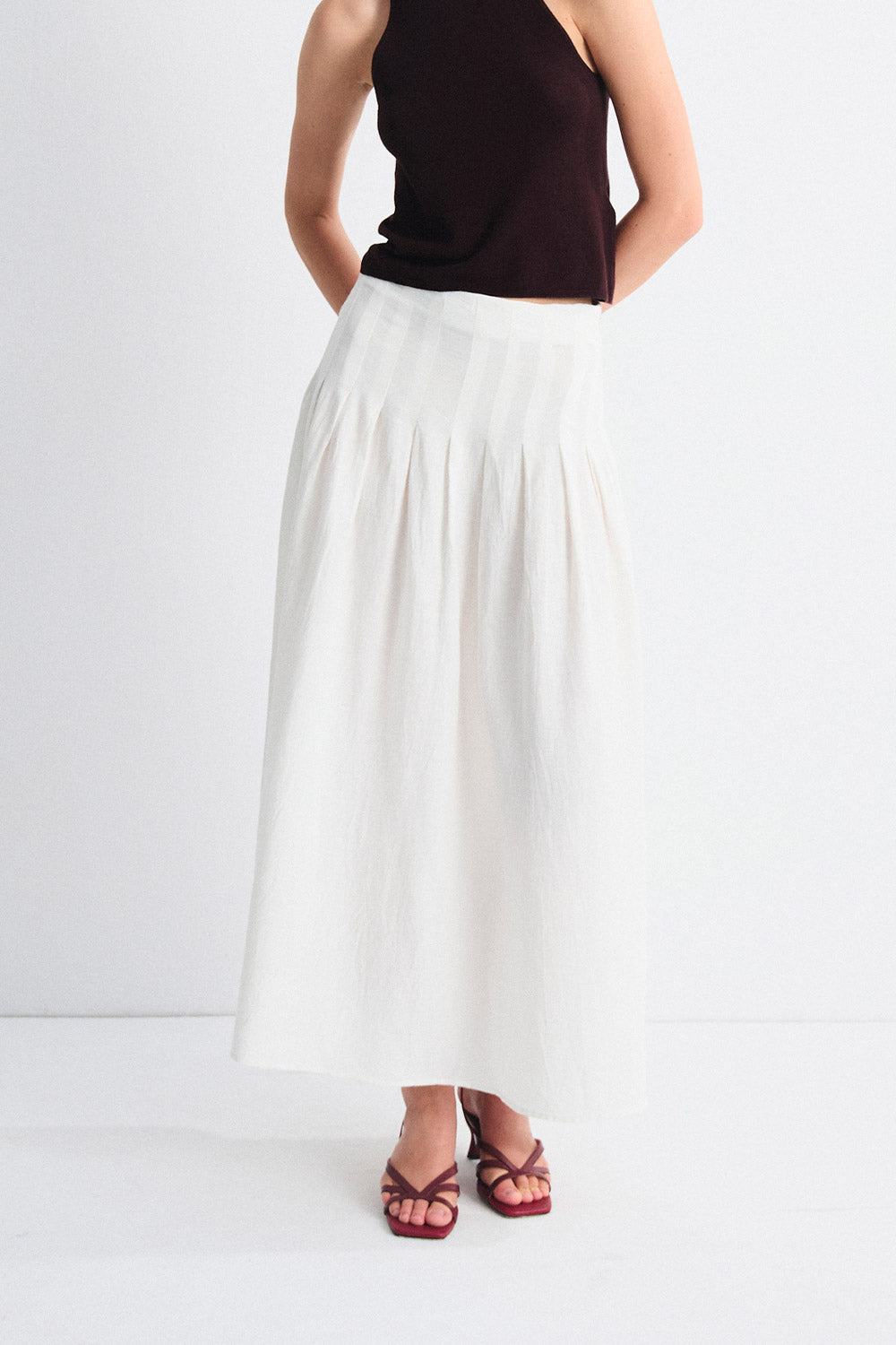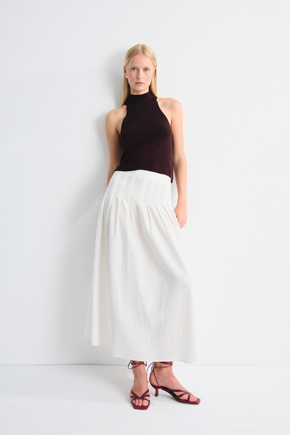 Falda con plisado en la zona superior y bajo con mucho vuelo. Cierre mediante cremallera invisible lateral. Combínala con el top Soleil para un total look sofisticado. También disponible el vestido de la misma familia.